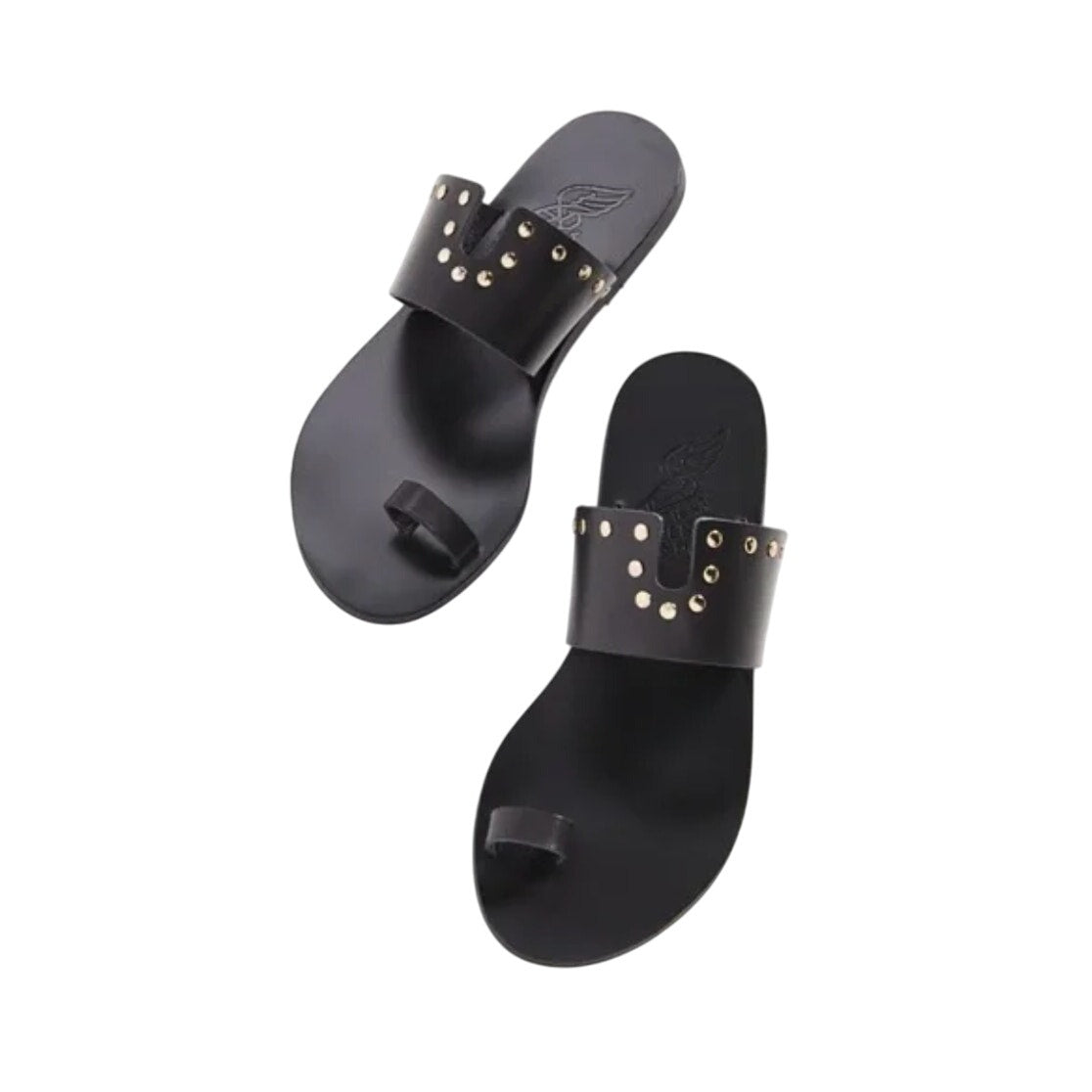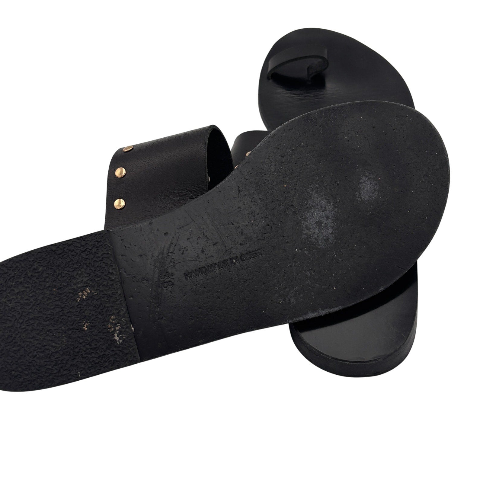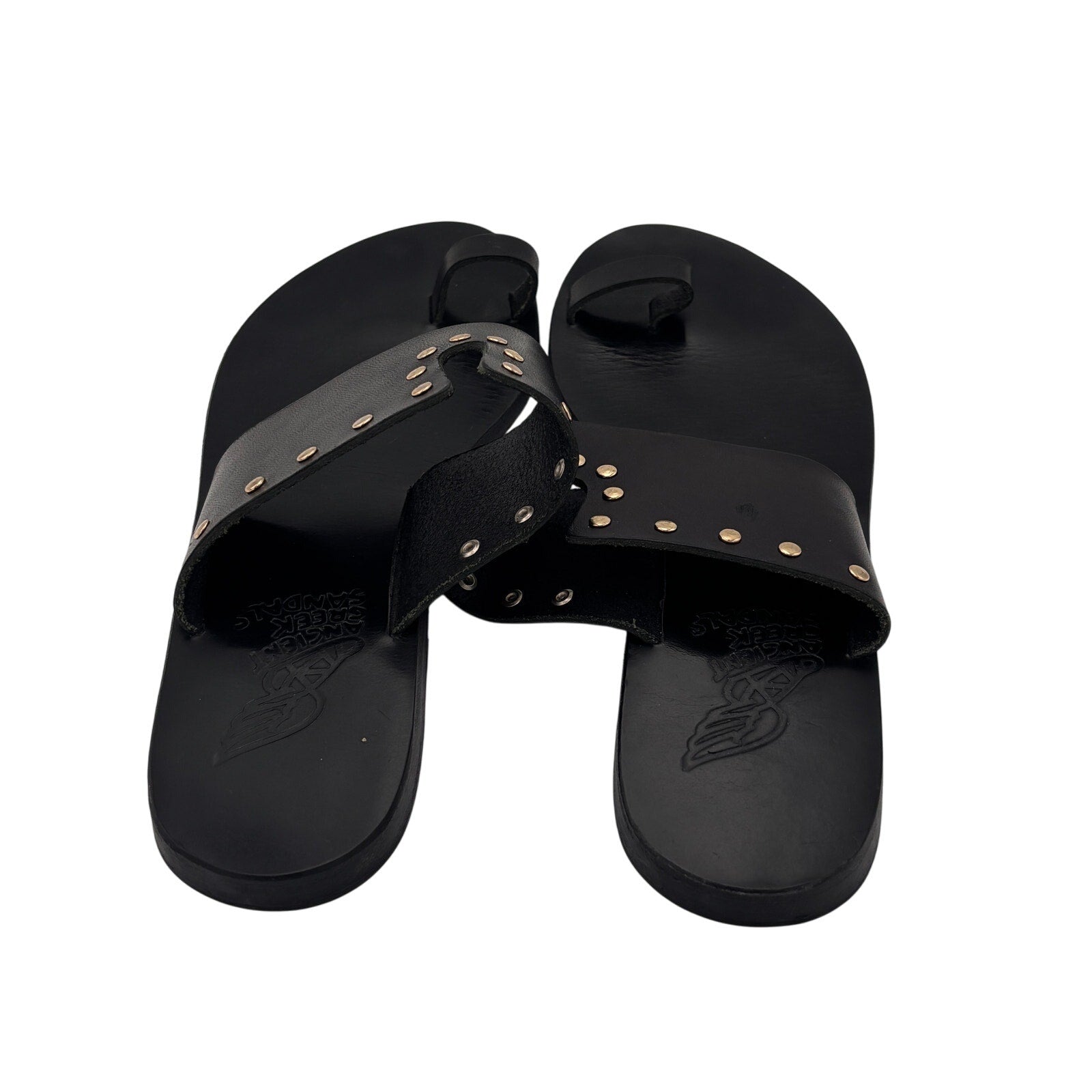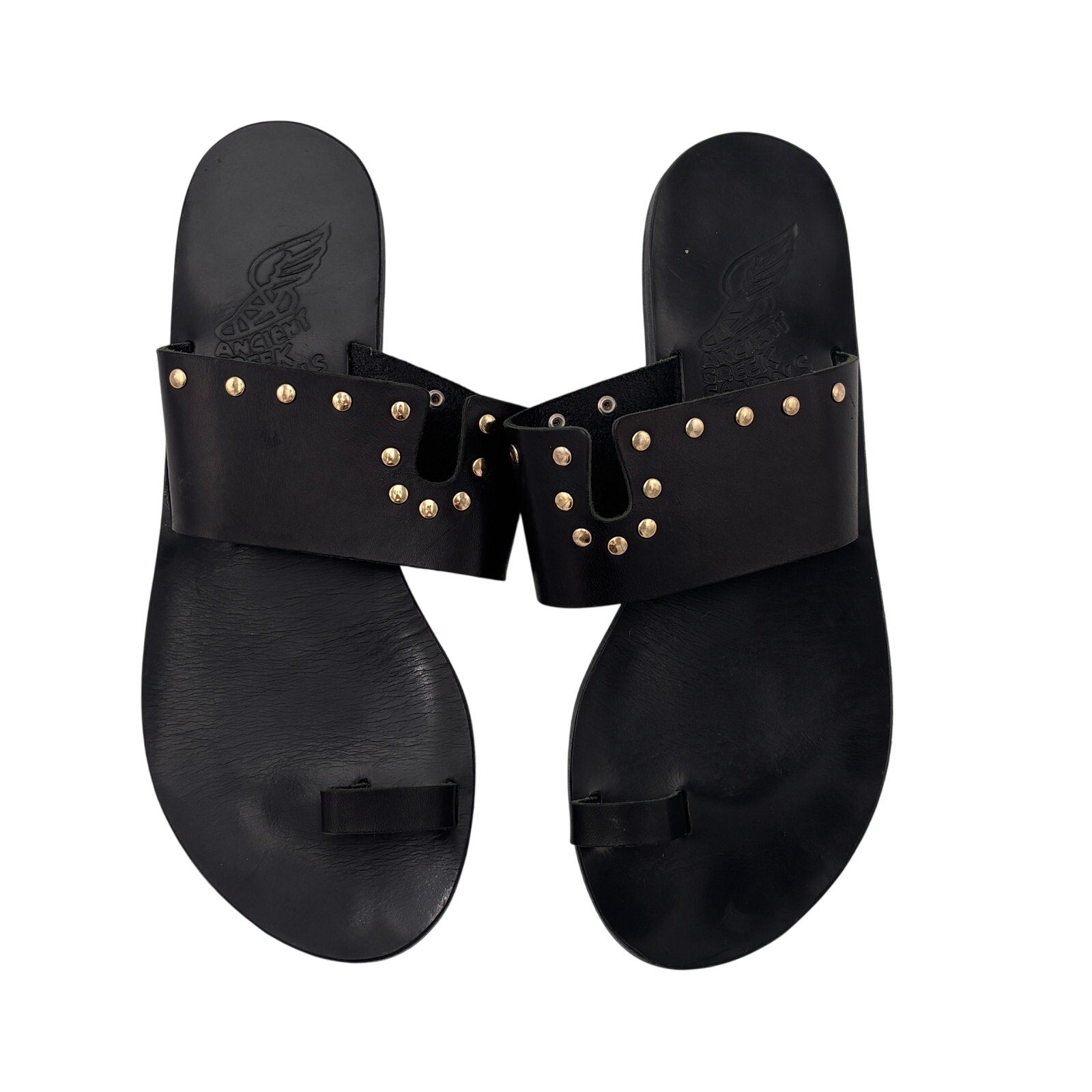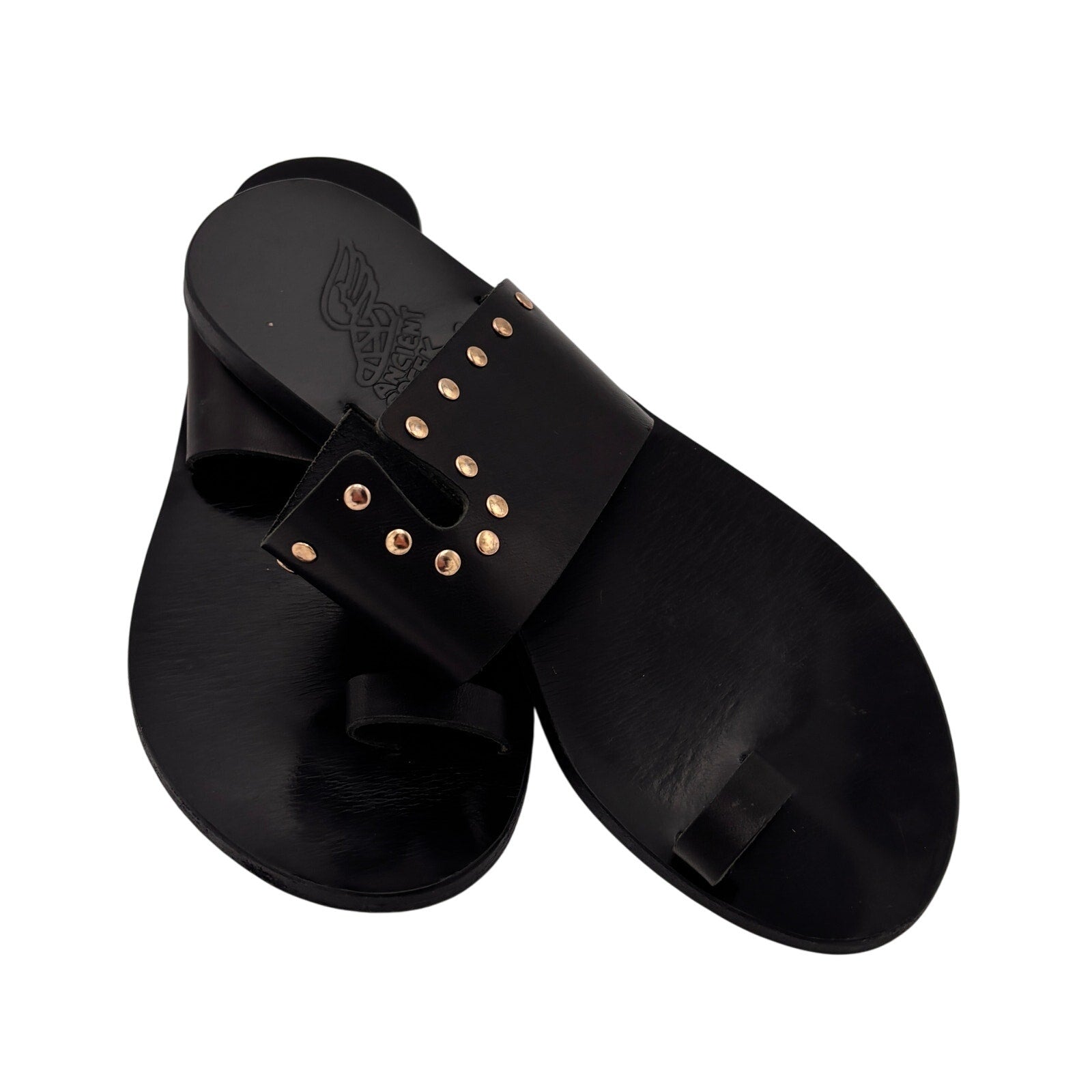 Keywords: Ancient Greek Sandals studded, black leather toe-ring sandals, Greek handcrafted sandals, designer flat slides, summer sandals, women’s size 38