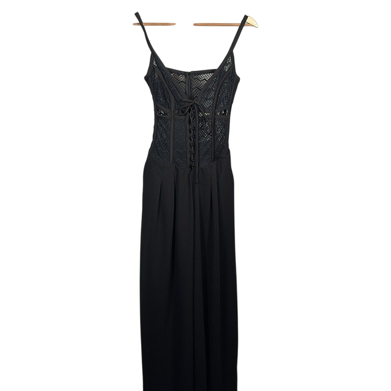 This stunning black jumpsuit by PatBO is perfect for a cocktail night out, featuring a sleeveless design with a daring plunge neckline. The gown-style silhouette offers a sophisticated and elegant look, making it a standout piece for any evening occasion. Plungeneck