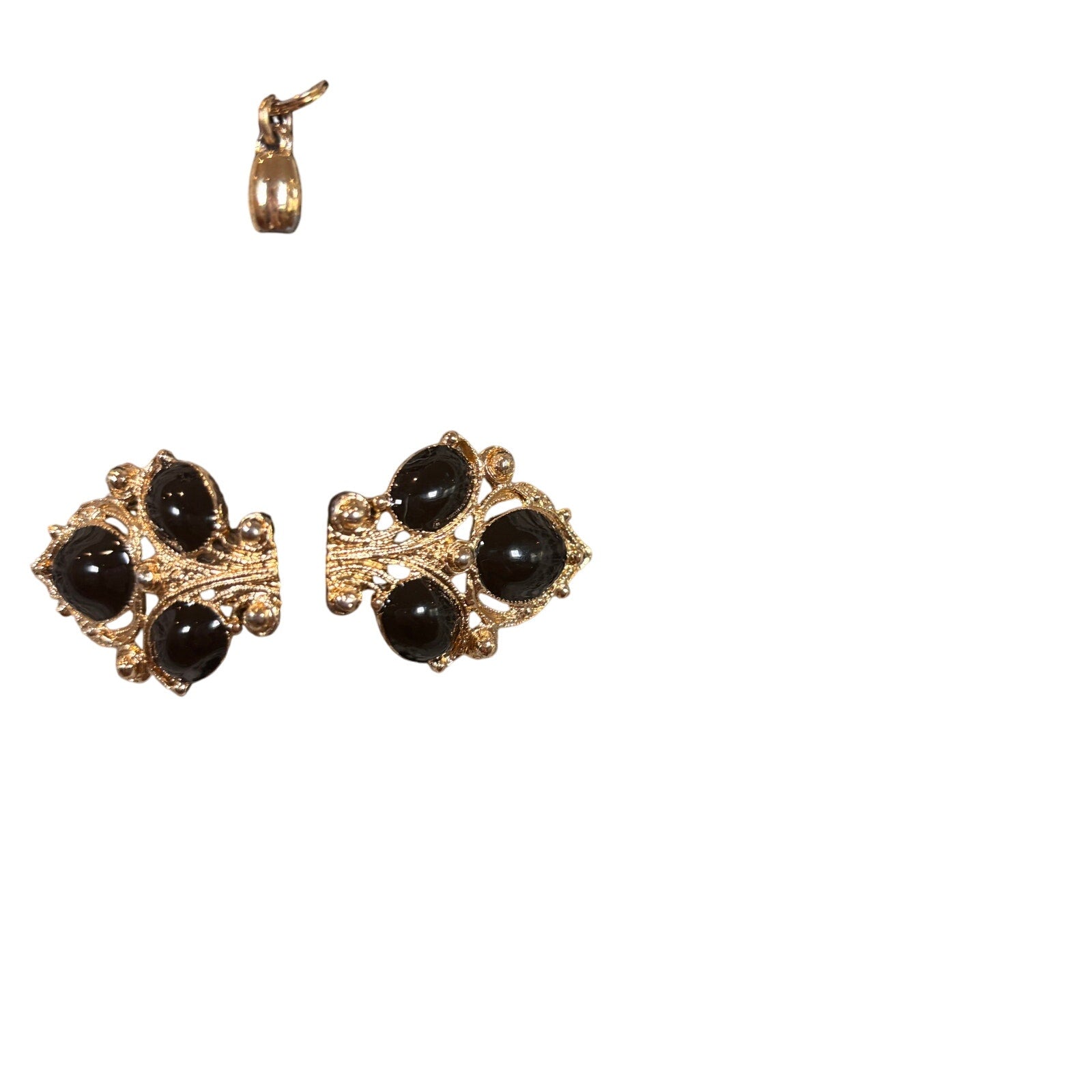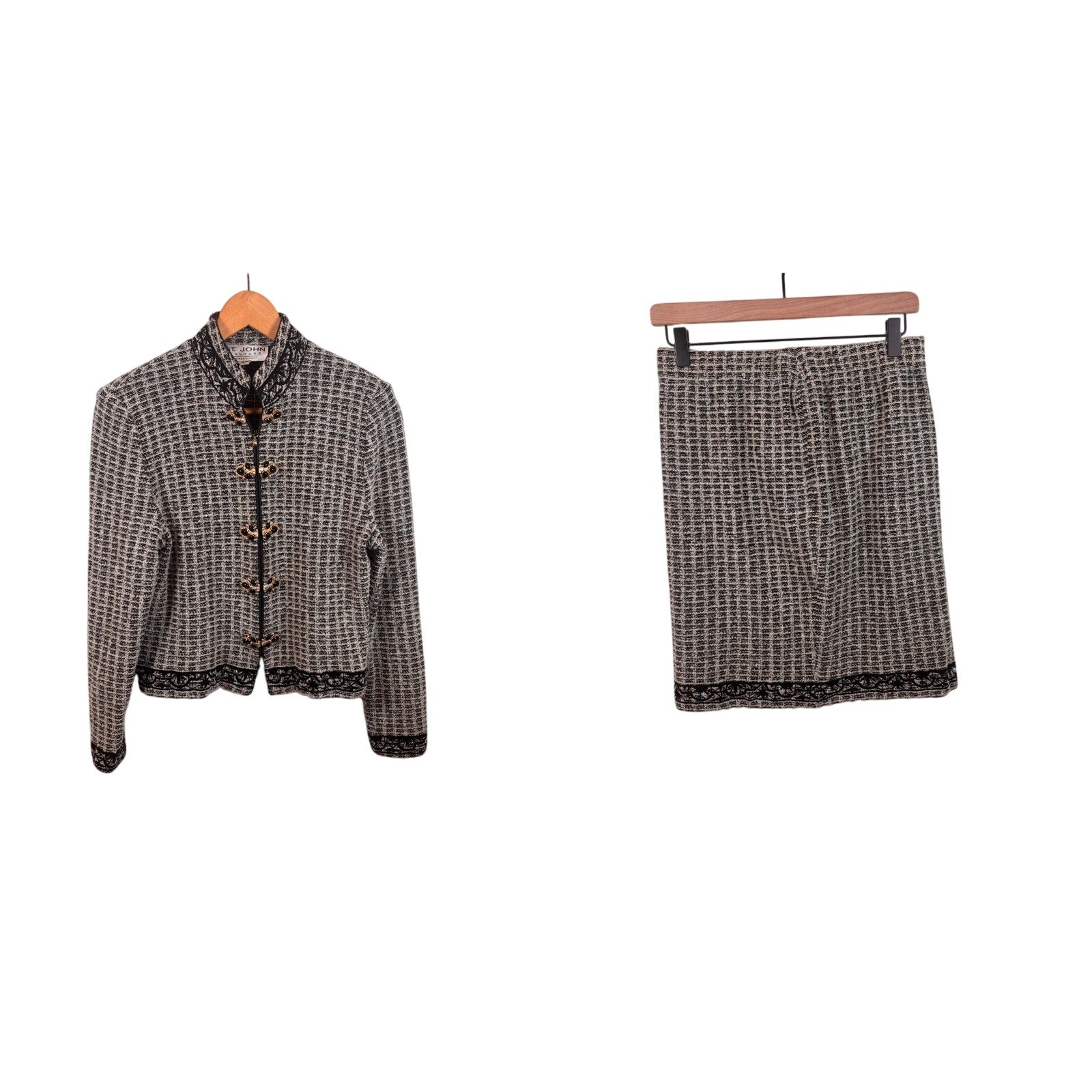 This St. John Couture suit set features a beautifully crafted black-and-gold tweed jacket paired with the matching skirt, delivering a complete couture look with unmistakable St. John sophistication. The jacket is adorned with jeweled embellishments that elevate the textured tweed, while the coordinating skirt maintains a sleek, tailored silhouette. Together, the set offers a polished, high-end ensemble perfect for events, evening wear, or elevated professional styling.