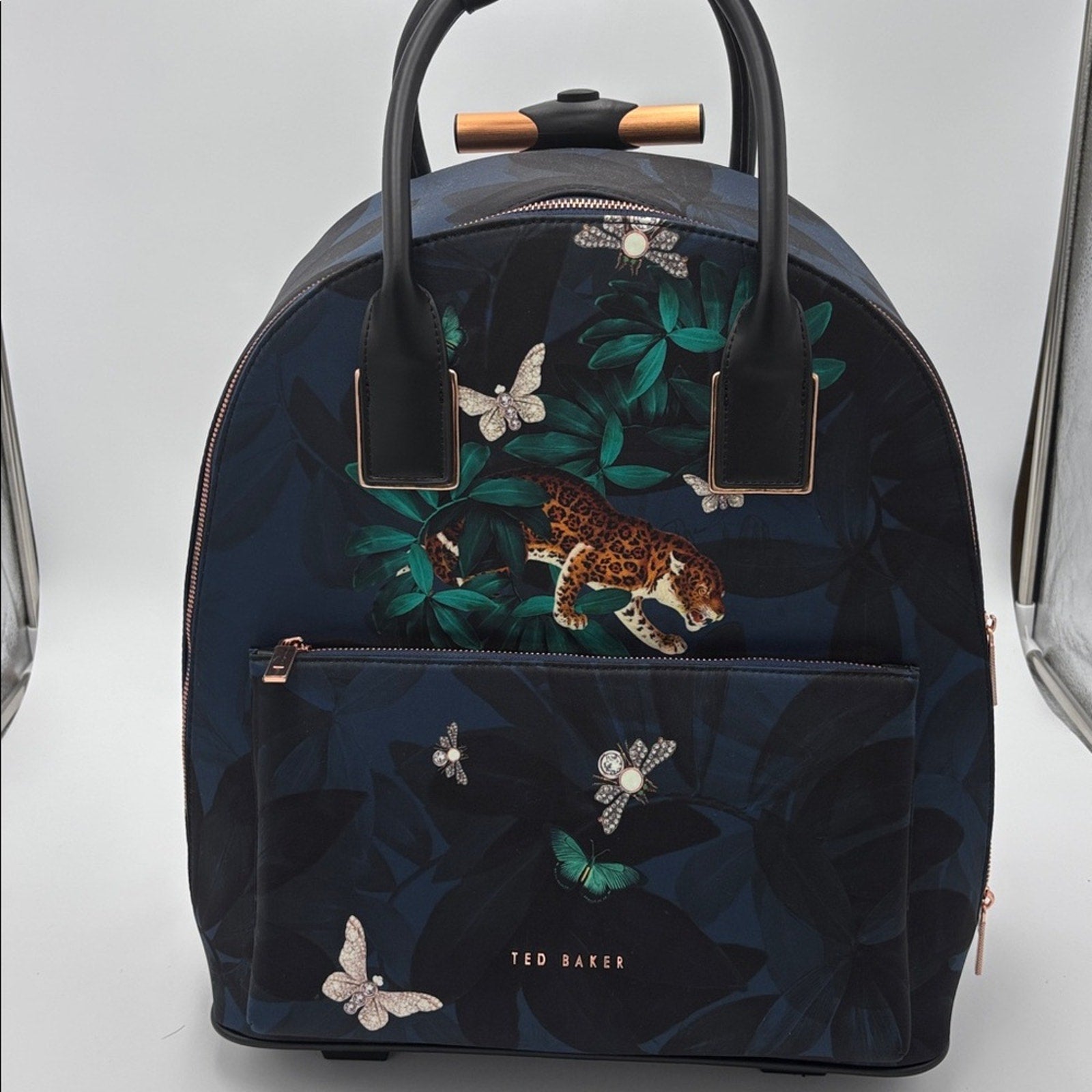 With its vibrant print featuring a snarling leopard and bejewelled insets, this striking travel bag turns any getaway into a stylish event. A deep interior holds everything you need for the journey, while an exterior pocket keeps necessities close at hand. Two wheels and a telescoping handle keep you rolling along, while dual top handles make this bag easy to pick up and carry. Style Name: Ted Baker London Rossiee Houdini Travel Bag. Style Number: 5805820. Pristine pre-owned condition.